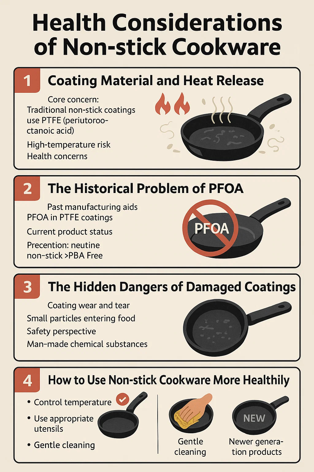 المخاوف الصحية: حمض بيرفلورو الأوكتانويك (PFOA) هو مادة لا تتحلل بسهولة في البيئة أو في جسم الإنسان. وبسبب المخاوف الصحية والبيئية، تم التخلص التدريجي من هذه المادة عالميًا ولم تعد تُستخدم في صناعة أواني الطهي الحديثة غير اللاصقة.