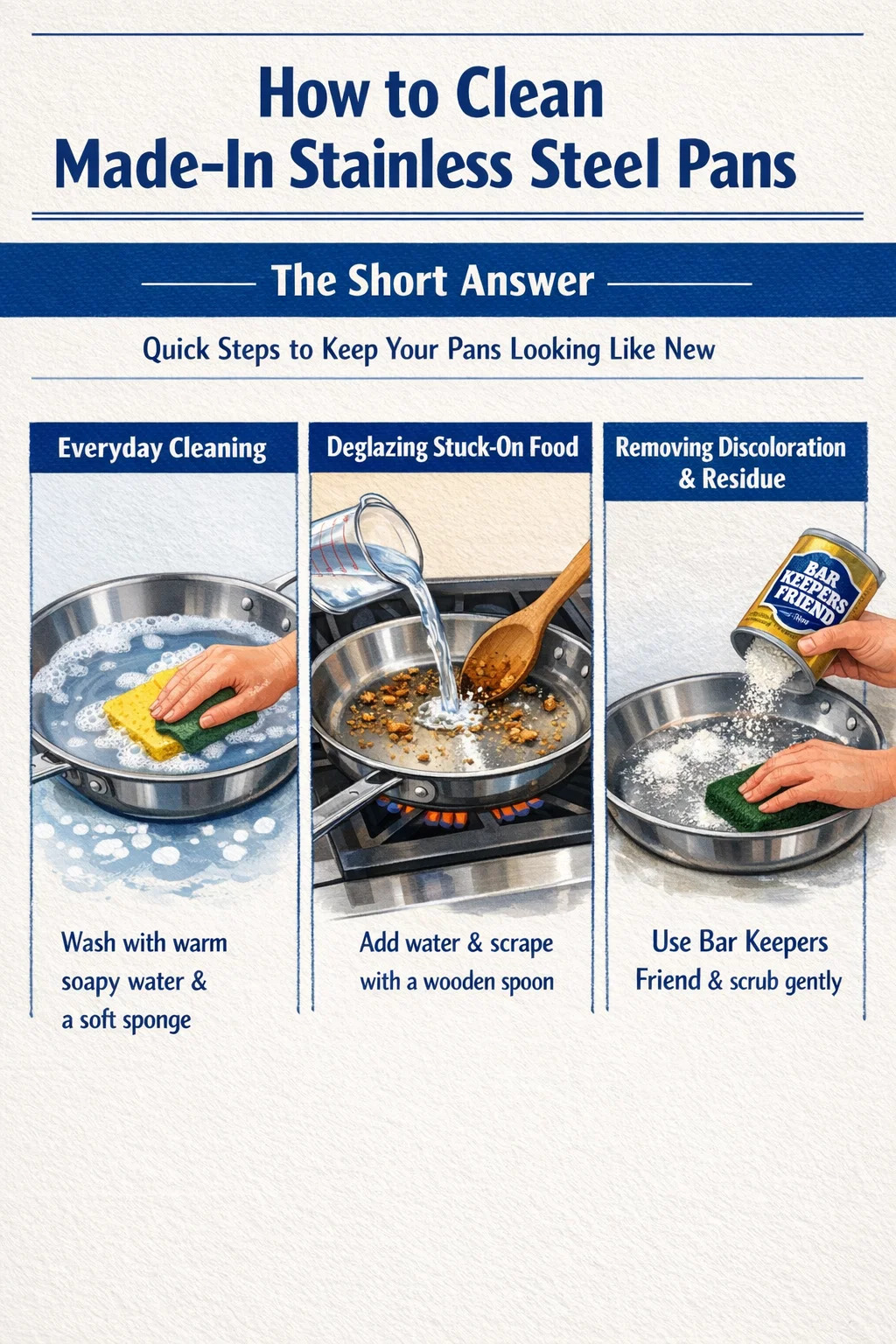 تقدم شركة Made-In ضمانًا مدى الحياة على أواني الطبخ المصنوعة من الفولاذ المقاوم للصدأ، ولكن لا يتم تغطية الأضرار التجميلية الناتجة عن التنظيف غير المناسب - بما في ذلك الخدوش الناتجة عن الوسادات الكاشطة أو تغير اللون بسبب مواد التبييض. ينطبق الضمان على عيوب التصنيع مثل انفصال الطبقات المستعبدة أو فشل المقبض. إن الحفاظ على نظافة المقالي باستخدام الطرق الواردة في هذا الدليل يضمن أداءً طويل الأمد وحالة صالحة للضمان.