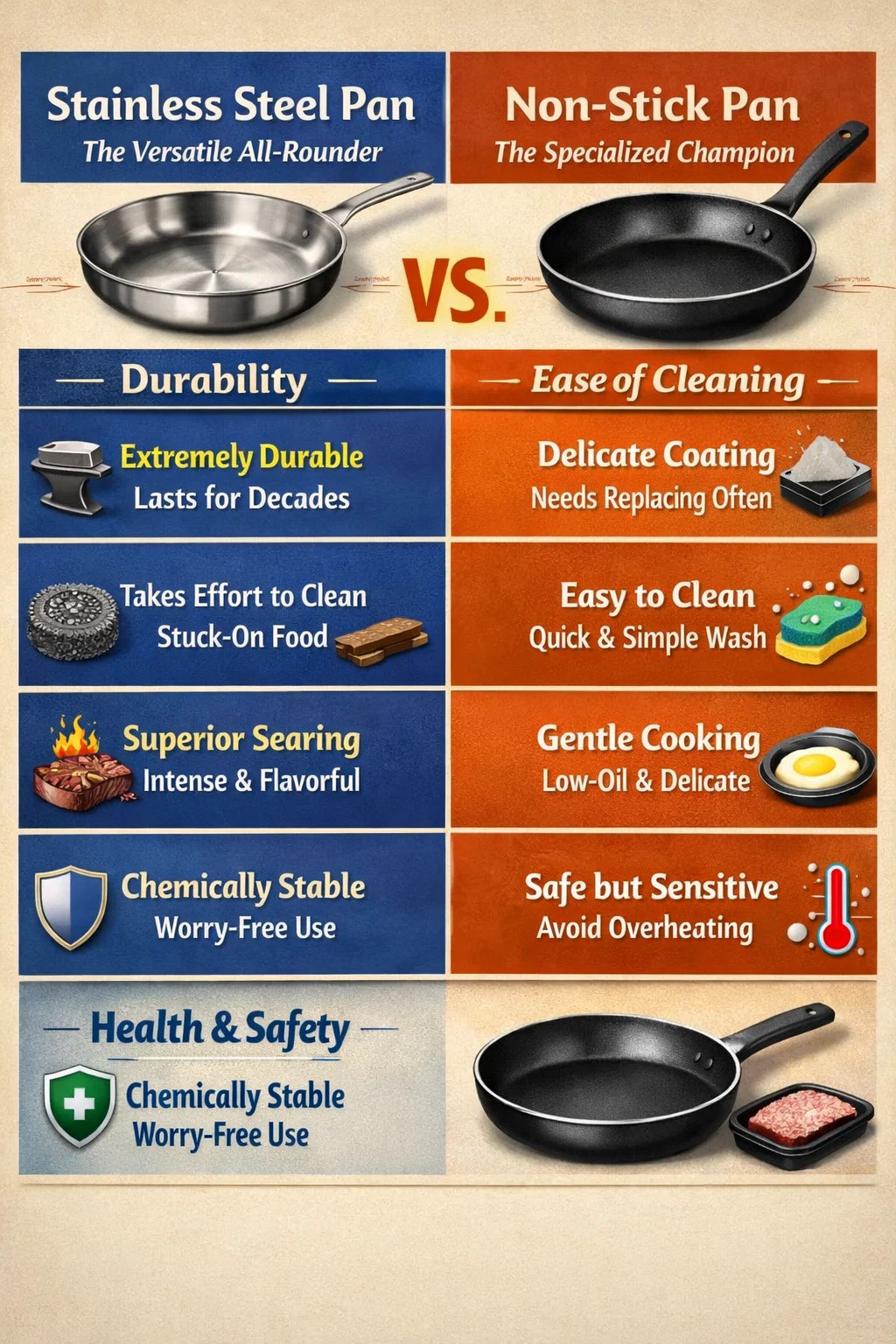 عند اختيار أواني الطهي، فإن لكل من المقالي المصنوعة من الفولاذ المقاوم للصدأ والمقالي غير اللاصقة مزاياها الخاصة. إنها ليست حالة يحل فيها أحدهما محل الآخر، بل هي أشبه بـ "متعدد الاستخدامات" و"بطل متخصص" في المطبخ.