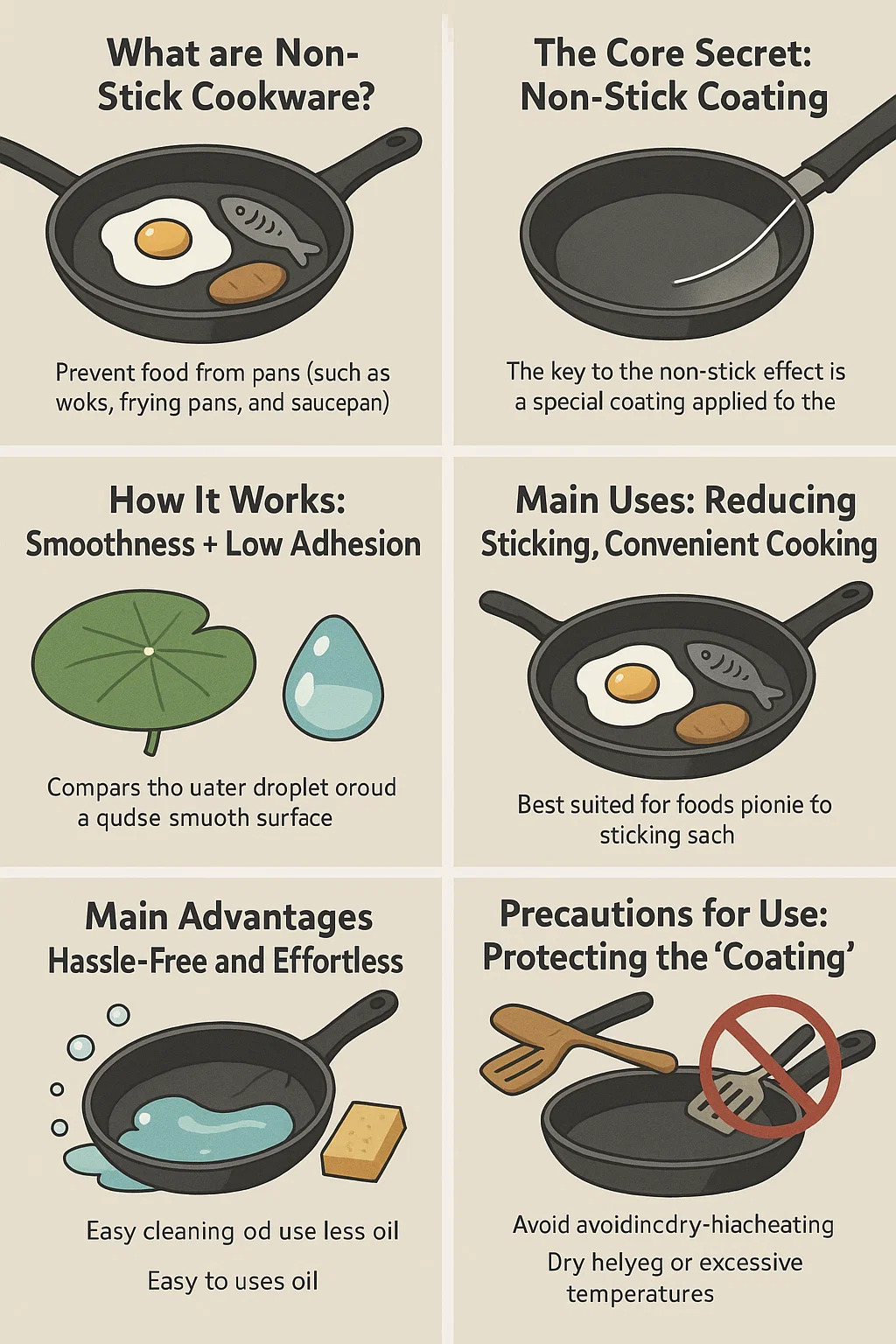 ببساطة، هي القدور والمقالي (مثل المقالي والمقالي والقدور) التي تمت معالجة سطحها الداخلي خصيصًا لمنع التصاق الطعام بالقاع أثناء الطهي. عند القلي السريع أو قلي البيض أو قلي السمك، لن يلتصق الطعام بسهولة بأسفل المقلاة.