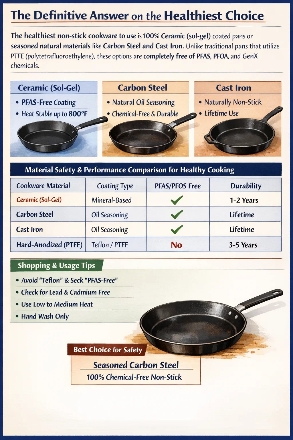 الأكثر صحة أواني طهي غير لاصقة للاستخدام هو مقالي مطلية بالسيراميك (سول جل) بنسبة 100% أو مواد طبيعية محنكة مثل الفولاذ الكربوني والحديد الزهر . على عكس المقالي التقليدية التي تستخدم PTFE (بولي تترافلوروإيثيلين)، فإن هذه الخيارات خالية تمامًا من المواد الكيميائية PFAS وPFOA وGenX. بالنسبة لأولئك الذين يبحثون عن المظهر الأكثر أمانًا على الإطلاق مع عدم وجود أي خطر كيميائي حتى في درجات الحرارة الحارقة، الصلب الكربوني المحنك يبرز باعتباره الخيار الأول لأنه يخلق حاجزًا ماديًا غير لاصق باستخدام الحرارة والزيت النباتي المبلمر فقط.