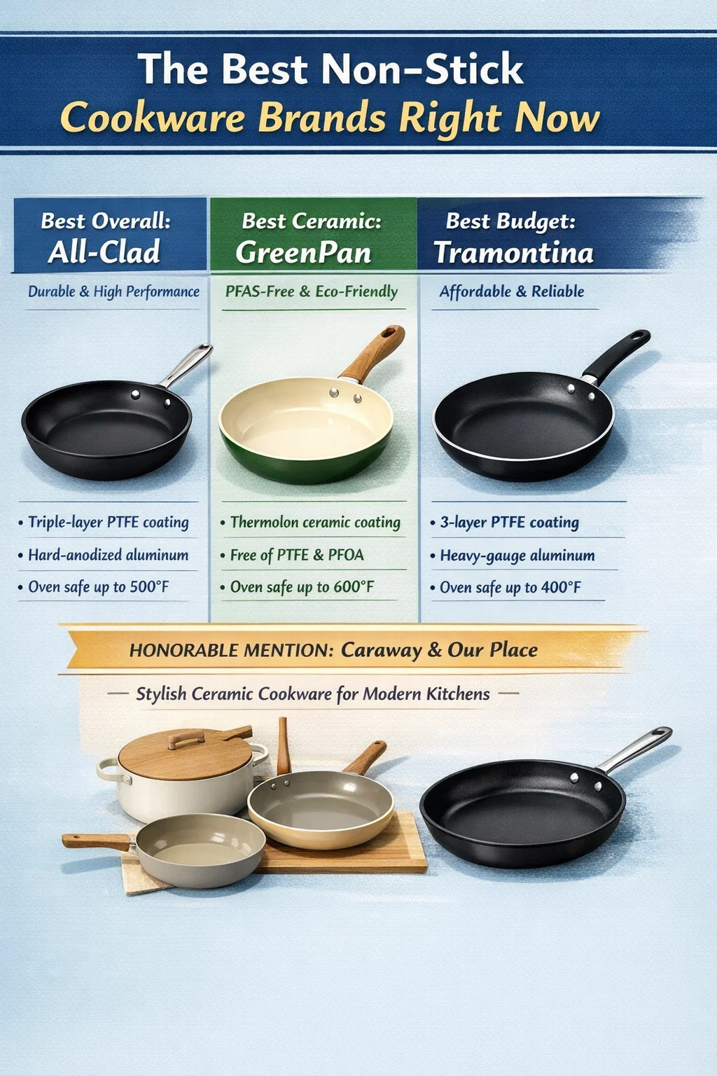 - أفضل علامة تجارية شاملة لأواني الطبخ غير اللاصقة: All-Clad - أفضل توازن بين المتانة والأداء الحراري والقيمة طويلة المدى للطهاة المنزليين الجادين.